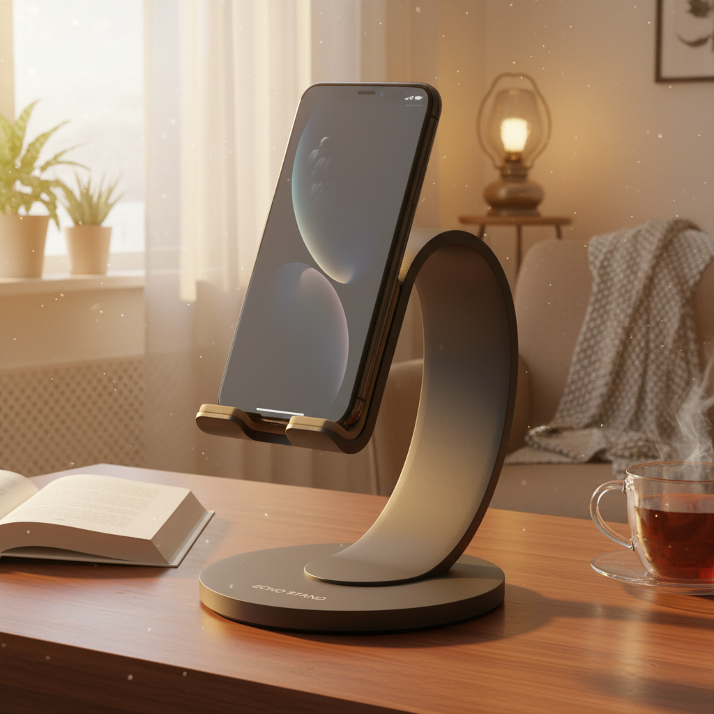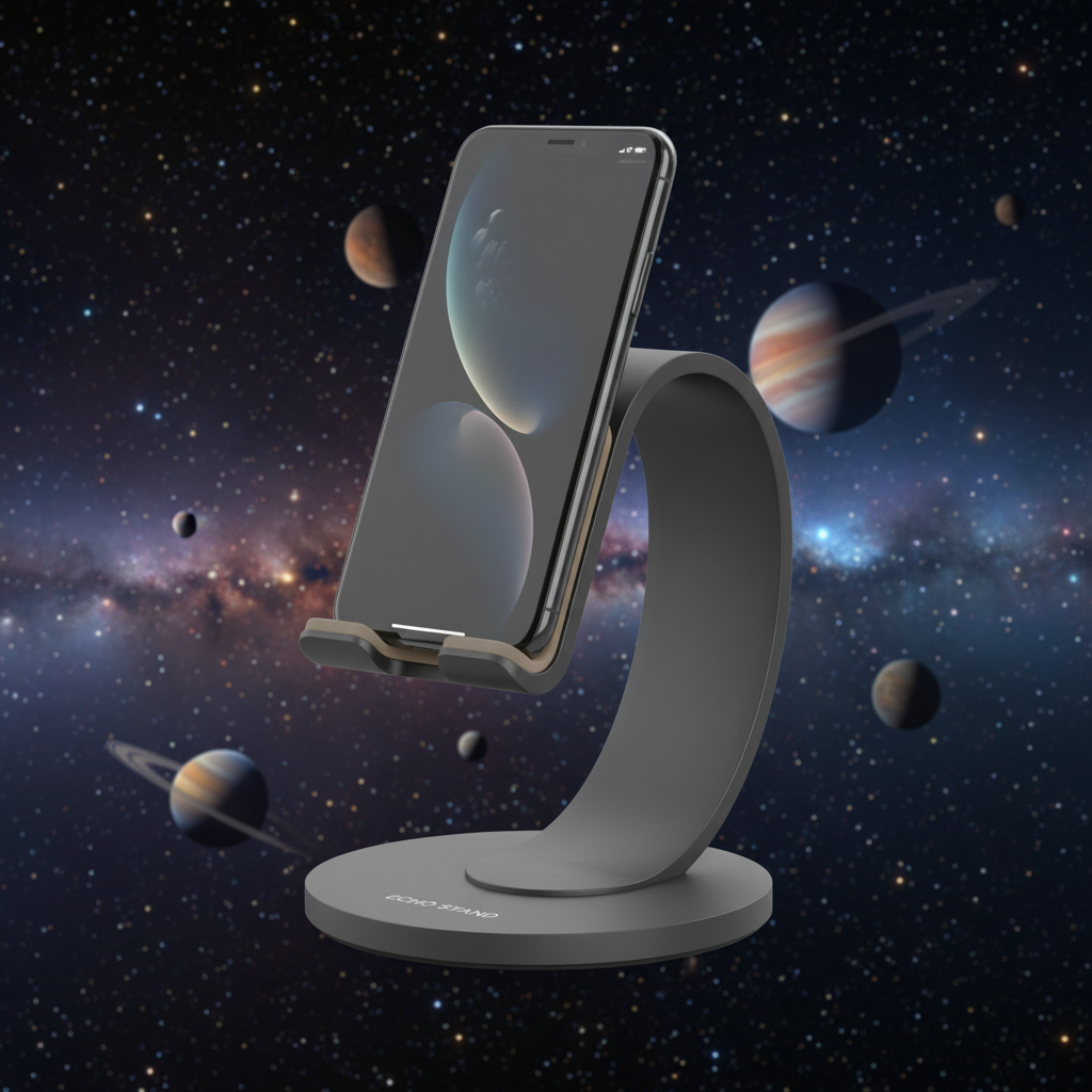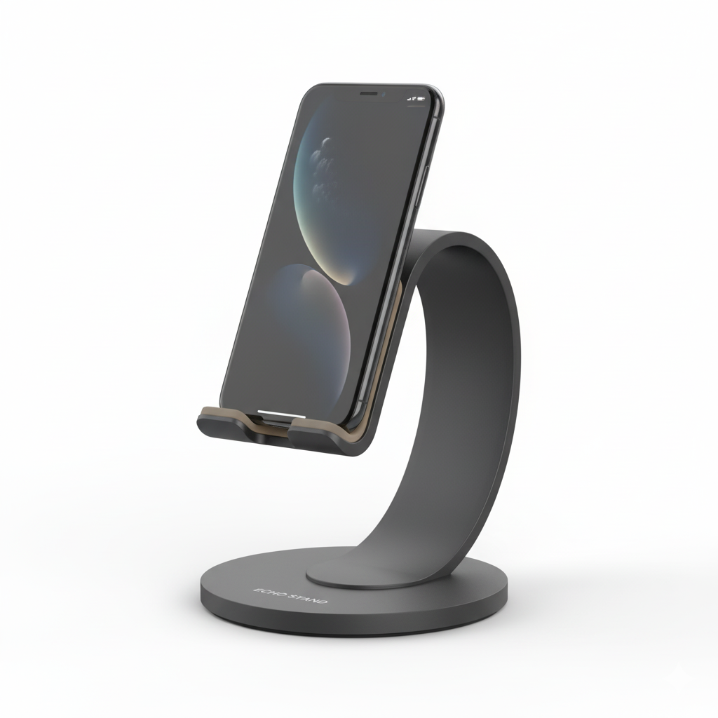 Wyobraź sobie, jak komfortowo możesz teraz pracować, oglądać ulubione seriale lub prowadzić rozmowy wideo bez konieczności trzymania telefonu. Ten designerski uchwyt to nie tylko praktyczny gadżet, ale również stylowy element dekoracyjny. Idealny dla osób pracujących zdalnie, spędzających dużo czasu przy biurku lub po prostu ceniących sobie porządek i wygodę. Uchwyt ma minimalistyczny, nowoczesny design w kolorze grafitowym. Na okrągłej podstawie widnieje napis „ECHO STAND”.